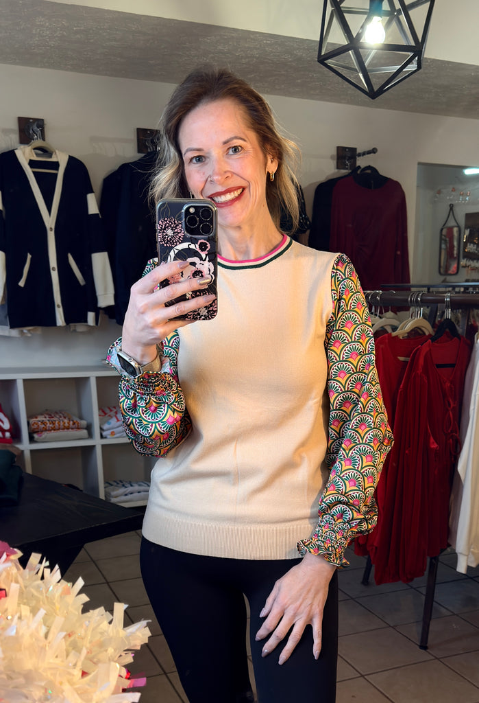 Beige Colorblock Top with Patterned Long Sleeves and Contrasting Neckline Trim