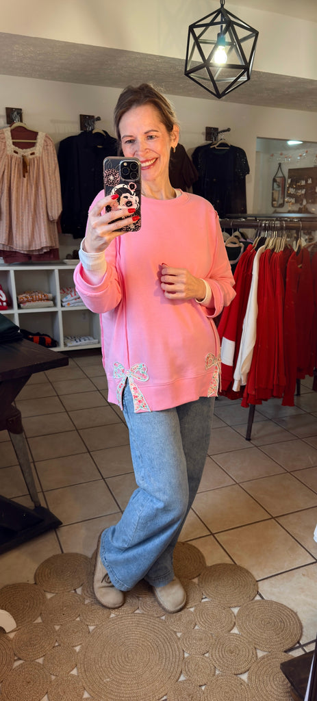 Candy Pink Pullover with Floral Bow Patchwork and Exposed Seams