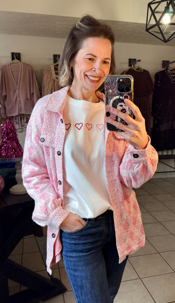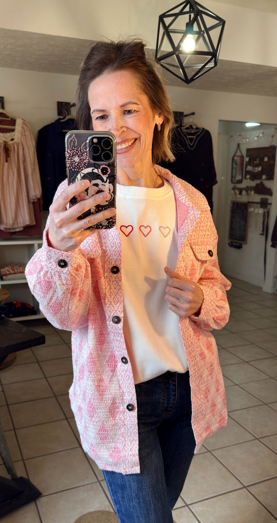Pairs perfectly with our pink geometric button up, shown in the try ons.
