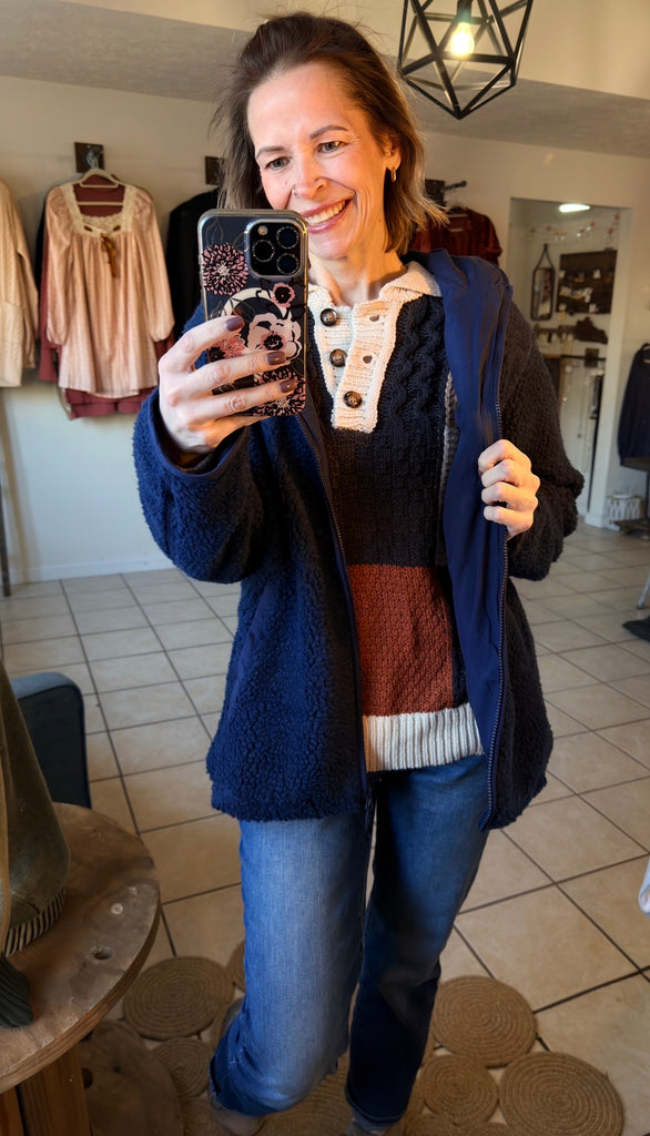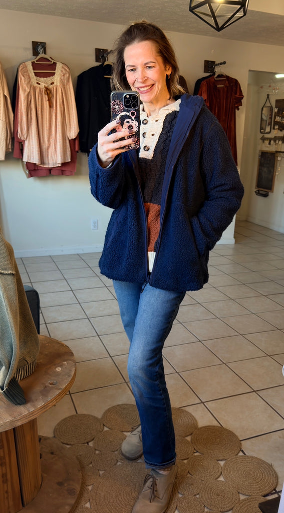 Navy Blue Zip Up Sherpa Hooded Jacket - Fully Lined