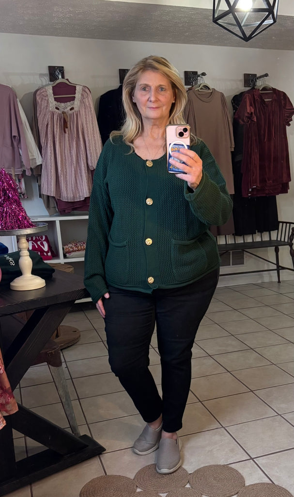 Curvy Dark Green Open Knit Button Front Cardigan with Gold Accent Buttons