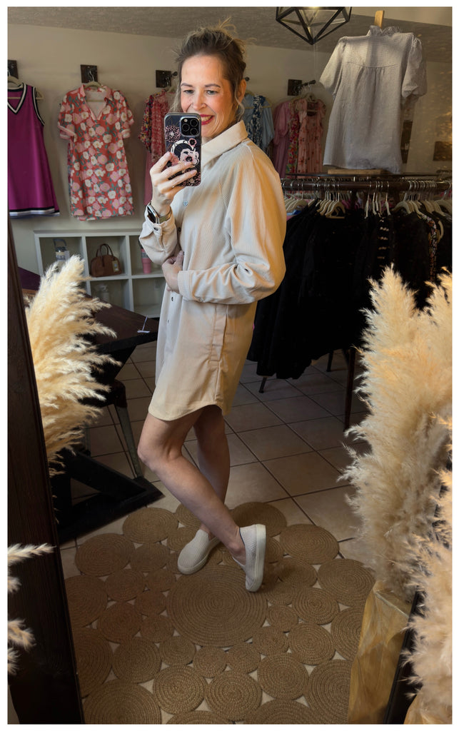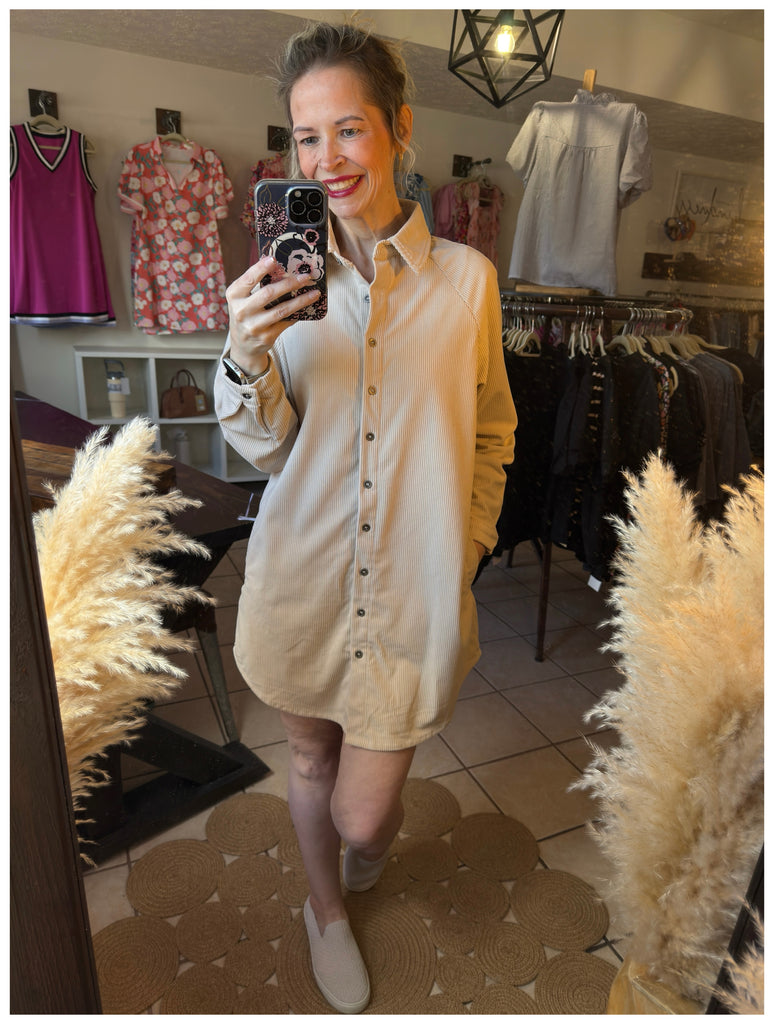 Beige Corduroy Button Up Long Sleeve Shirt Dress