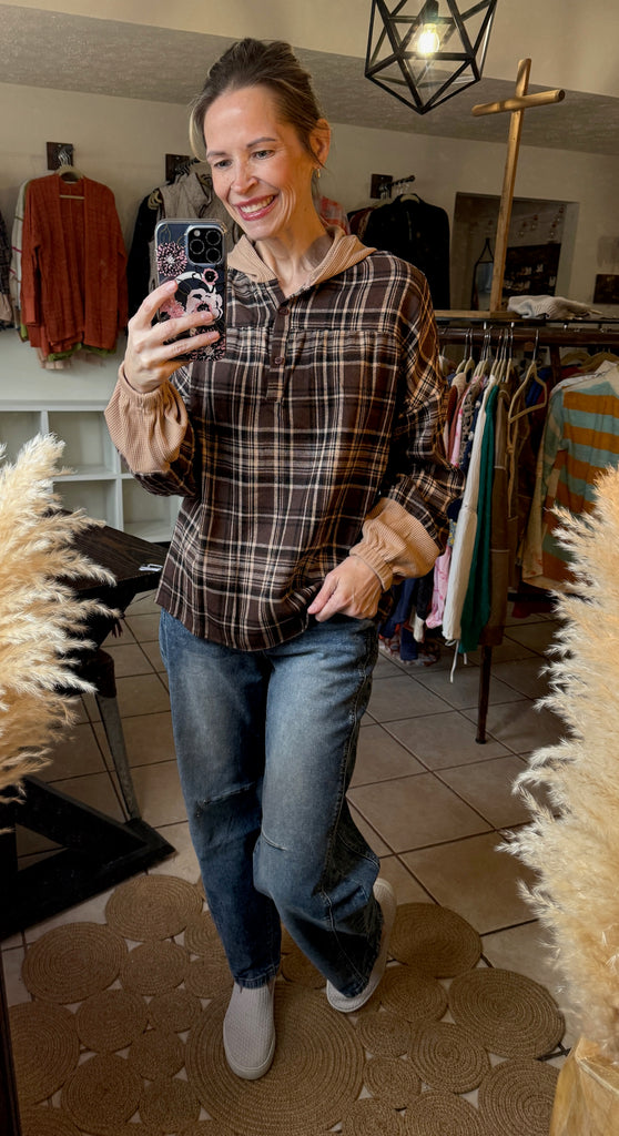 Brown Plaid Flannel Pullover with Contrasting Waffle Knit Hood