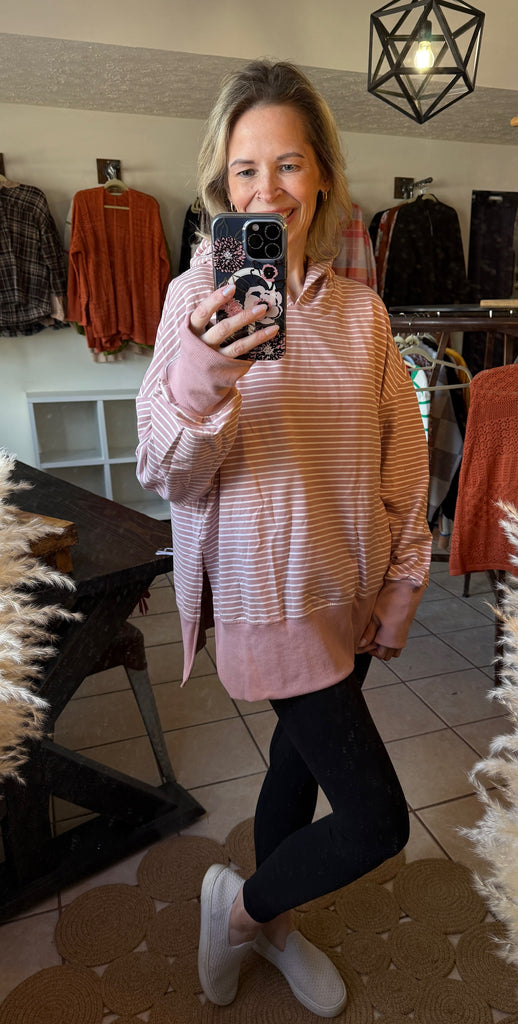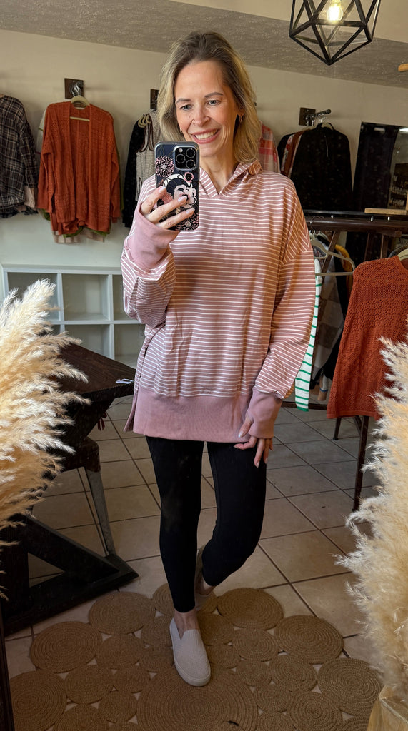 Mauve Striped Hoodie Pullover with Thumbholes and Side Slits