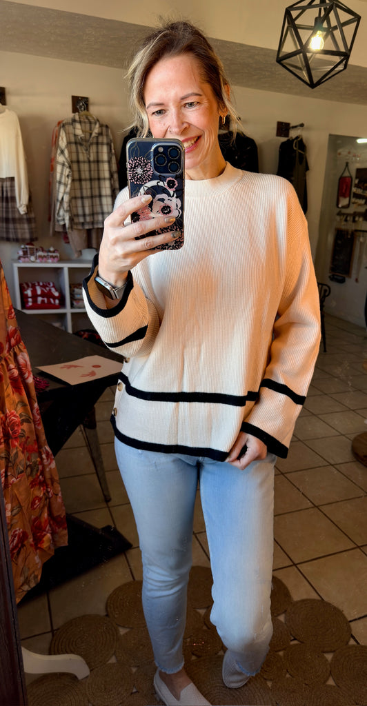 Beige with Black Contrast Stripes Sweater with Button Side Details