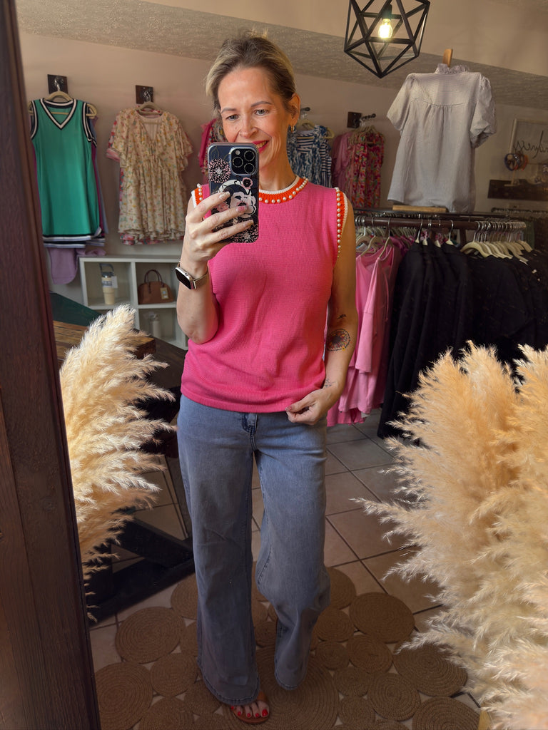 Pink Contrast Trim Lightweight Sweater Knit Tank with Pearl Embellishments