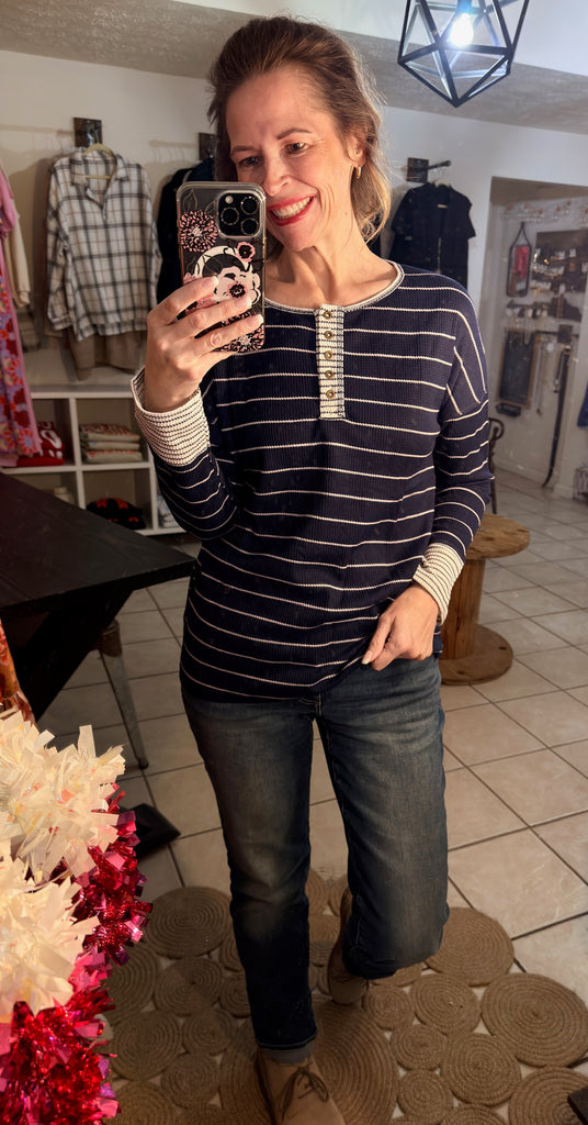 Navy Blue and White Striped Long Sleeve Waffle Textured Top