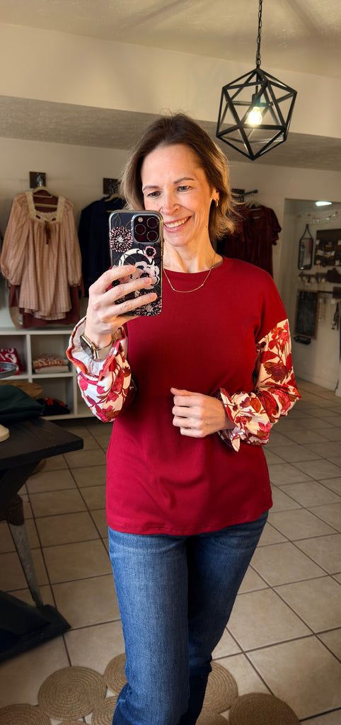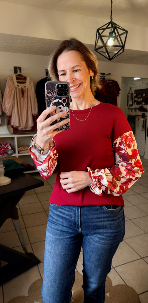 Red Dahlia Ribbed Long Sleeve Top with Floral Contrasting Sleeves