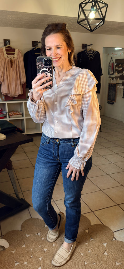 Taupe and White Checkered Button Up Blouse with Ruffle Details