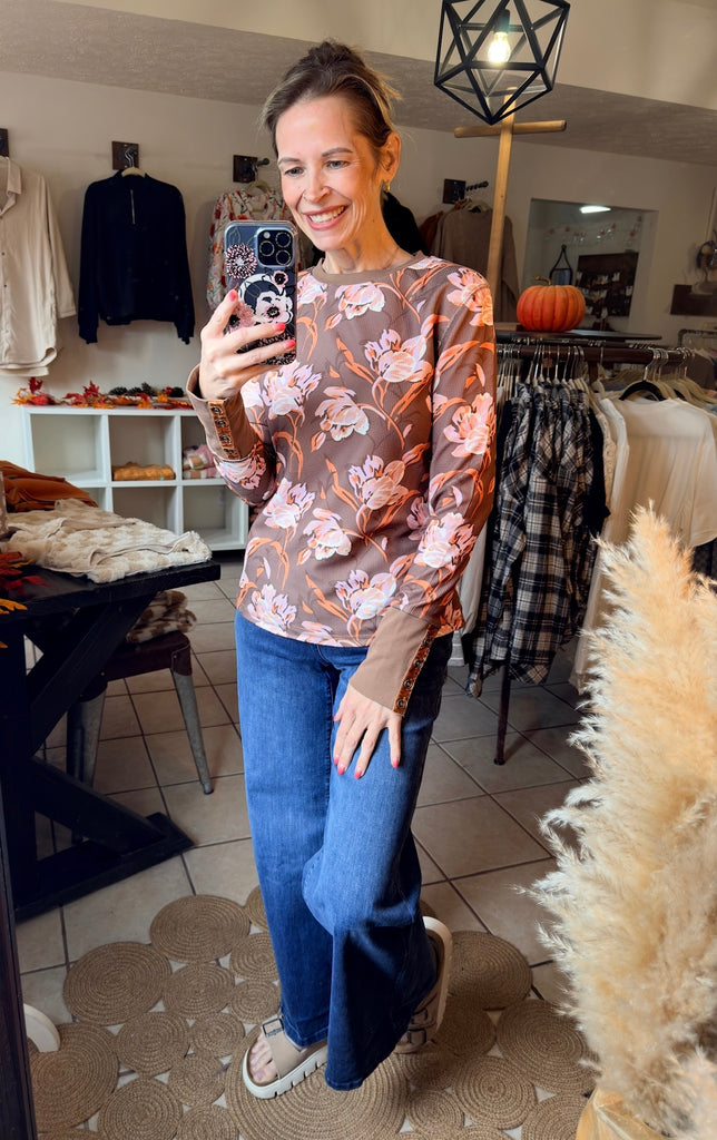 Brown Floral Waffle Texture Long Sleeve Top